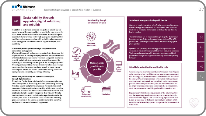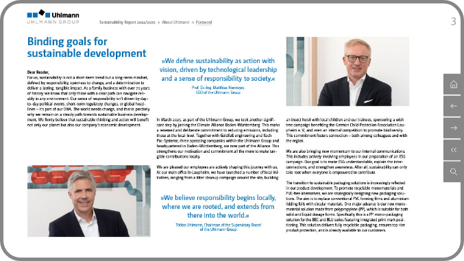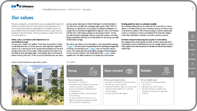 Once again, we supported the world’s leading system provider for pharmaceutical packaging in preparing its sustainability report, marking our fourth collaboration. For the first time, the report was accompanied by a voluntary GRI audit by DEKRA, with all of the precise content and design adjustments fully implemented by our team. Proven elements were retained in the reporting year, including clear chapter color coding, a structured presentation along defined fields of action, and the visualization of complex content through process diagrams and interactive features. Uhlmann continues to report in reference to the GRI standards and incorporates the UN Sustainable Development Goals.